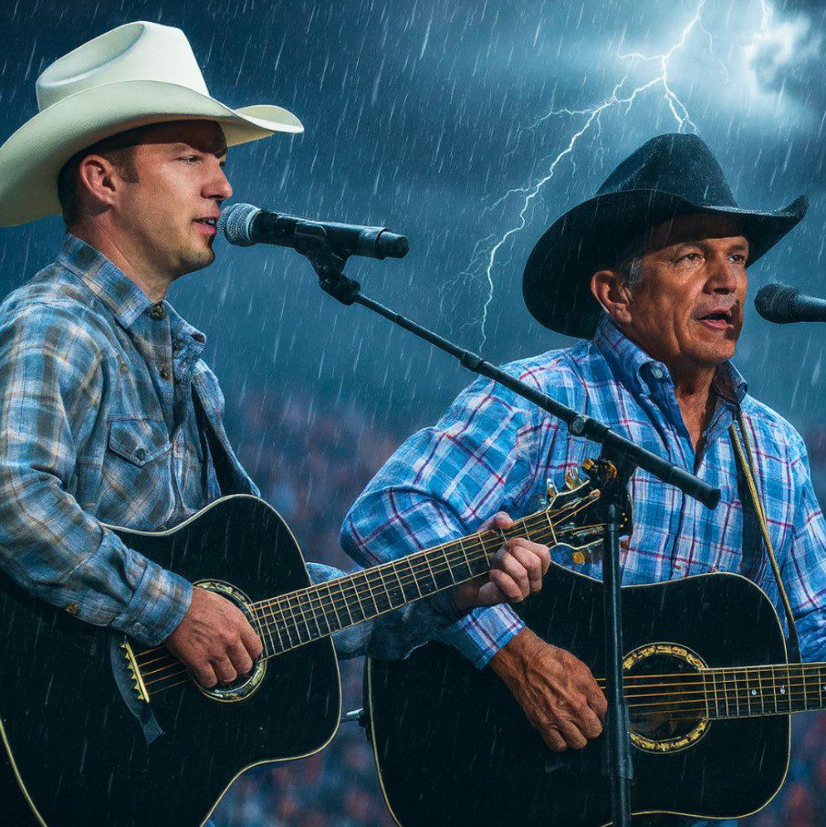 As George and Bubba played, the storm seemed to listen. The song they chose wasn’t one of his chart-topping anthems or radio hits — it was a simple, heartfelt ballad about love, faith, and resilience. The crowd fell completely silent. The rain softened, almost respectfully, as if nature itself understood the significance of what was happening.